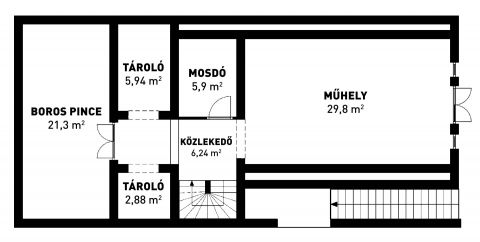 - nappali-étkező-konyha, gardrób, 2 szoba, 2 fürdőszoba, háztartási helyiség, tárolók, kamra, közlekedők, borospince