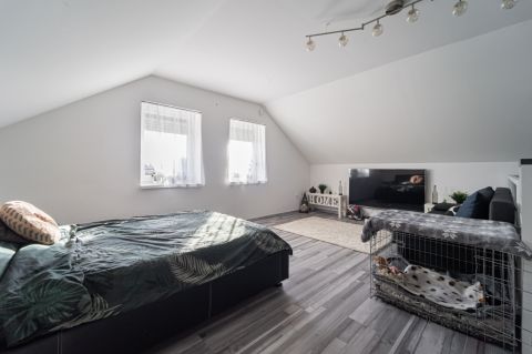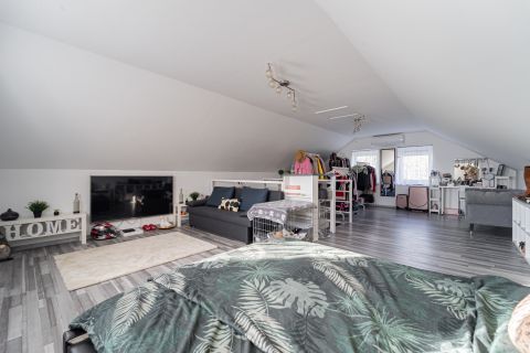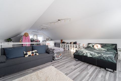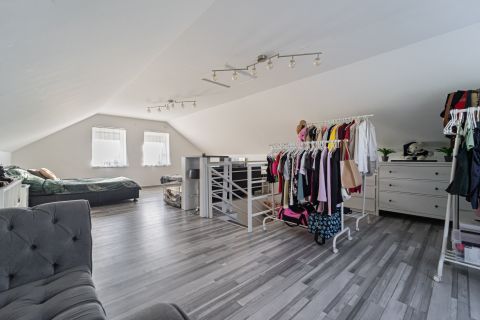 -Az emelet egy egybefüggő közel 30 négyzetméteres tágas tér, ahol akár két hálószoba is kialakítható. Jelenleg vendégszobaként és gardróbként funkcionál.