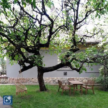 Nyugodt barátságos környezet, gyümölcsfák szőlőlugas, virágoskert.
