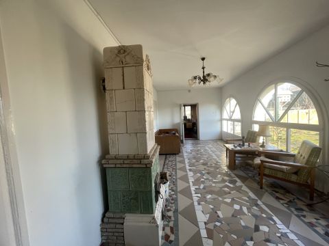 Három boltíves, világos előszobai társalgó díszmozaik burkolattal és egyedi cserépkályhával