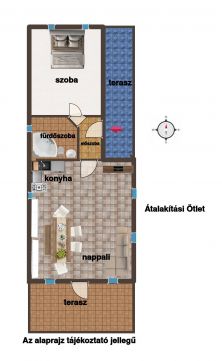 Helyiségeit tekintve:amerikai konyhás nappali,egy 9 nm -es valamint egy 6 nm -es hálószoba.