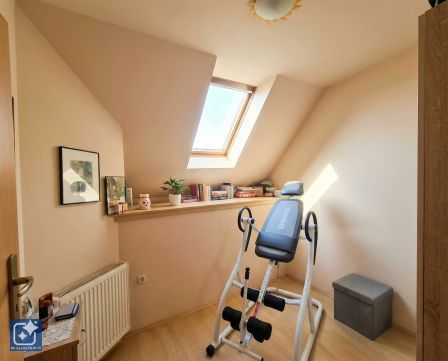 A tetőtérbeépítésből nyílik 3 félszoba, a fürdőszoba és egy külön apró helyiség WC-vel. A 7-8 m2-es, tiszta területtel rendelkező napsütötte, világos szobák jó elrendezésüknek és a kényelmes belmagasságnak köszönhetően méretük ellenére tágasnak tűnnek, kényelmesen elfér mindegyikben az intim életérzést keltő berendezés és elegendő teret nyújtanak a pihenésre, tanulásra, elmélyülésre. Minden helyiségben a barna, tömörfa nyílászárók a jellemzőek.
