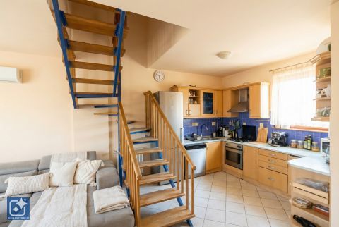Az amúgy is világos, az utcai és udvari oldal felőli ablakok általi körbe-napozás miatt egész napon át napfényes nappali-étkező-konyha élettérből a jó idő kicsábítja az embert a szabadba. Erre lehetőséget nyújt az ugyancsak tágas teraszon elköltött családi ebéd, sütögetés vagy finom kávézás. A konyhai élettér az utcafronti ablakhoz közeli és hidegburkolattal ellátott. A nappali és étkező padlója diszkréten elválasztja egymástól a tágas életteret. A radiátoros fűtésen túl egy hűtő-fűtő klíma szolgálja a kellemes hőérzetet.