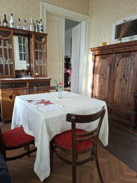 A telek 1242 m², rajta egy nettó 92 m² alapterületű villa, beépíthető tetőtérrel. Hozzá tartozik még egy 18 m²-es fedett terasz és egy 49 m² pince. A villa déli fele eladó. A ház melegét két álló cserépkályha biztosította, de bevezették a gázt is és gázkonvektorral is lehet fűteni az épületet. A villában 2 db 31 m² szoba található, illetve egy étkezős nappali, konyha, fürdő WC-vel.