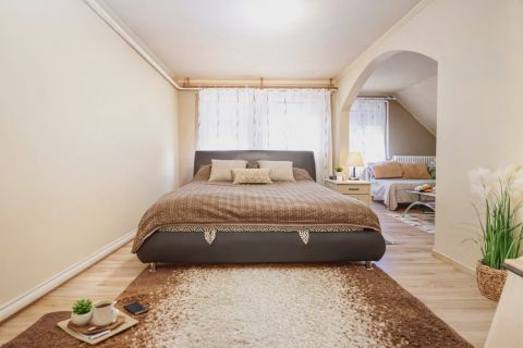 Zöld, rendezett, nyugodt utca. Kiváló tömegközlekedés, iskola, óvoda, boltok, posta, orvosi rendelő, patika a közelben