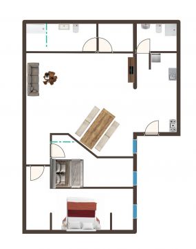 2 hálószoba franciaággyal, gardróbbal és íróasztallal. 1 fürdőszoba zuhanyzóval, wc-vel és külön mosdó.