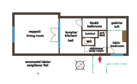 nappali, hall/konyha-étkező, háló és a mellékhelyiségek