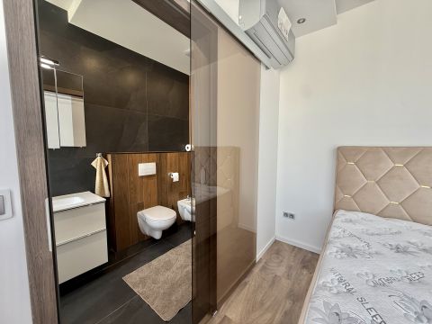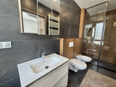 A fő hálószoba igazi privát szféra, saját fürdőszobával és gardróbbal. Emellett egy további szoba, egy kádas és zuhanyzós fürdőszoba, külön toalett, tágas előszoba, valamint praktikus háztartási helyiség is rendelkezésre áll.
