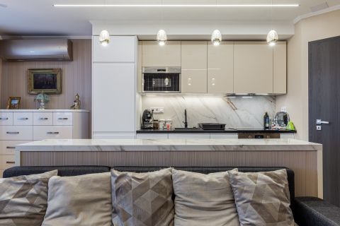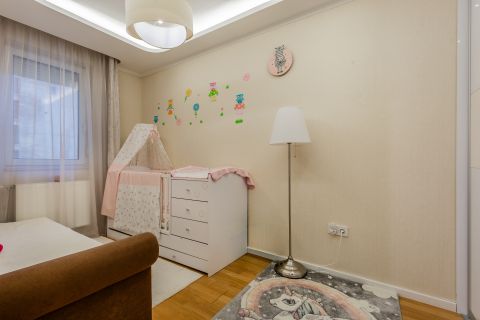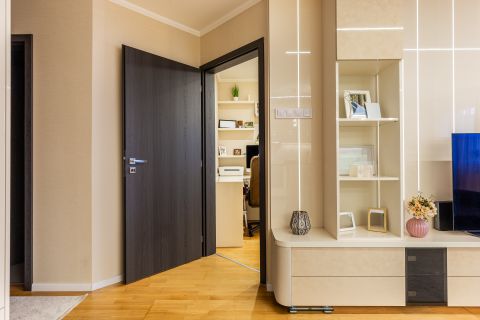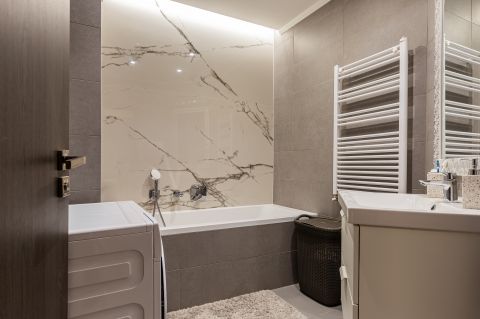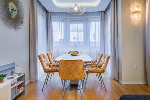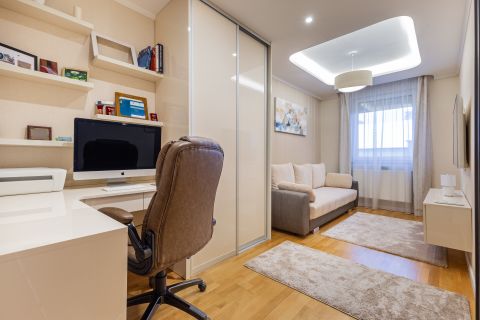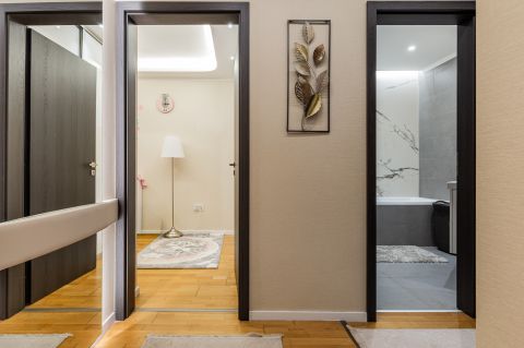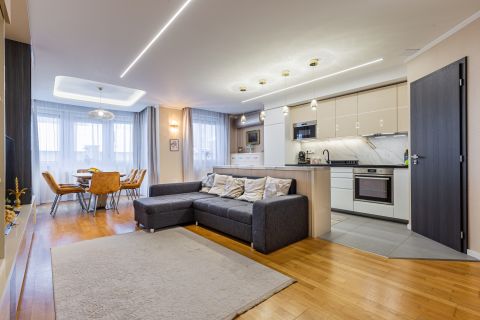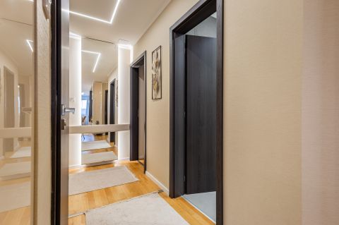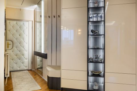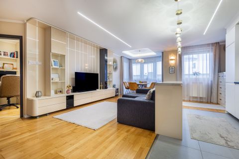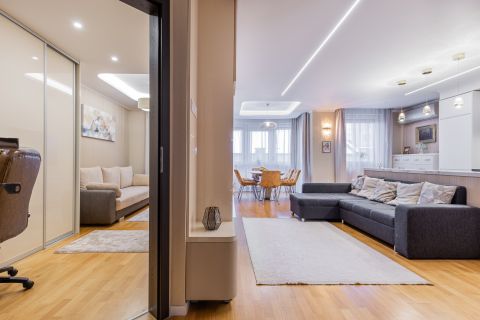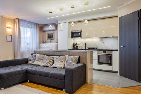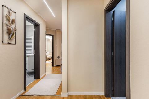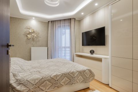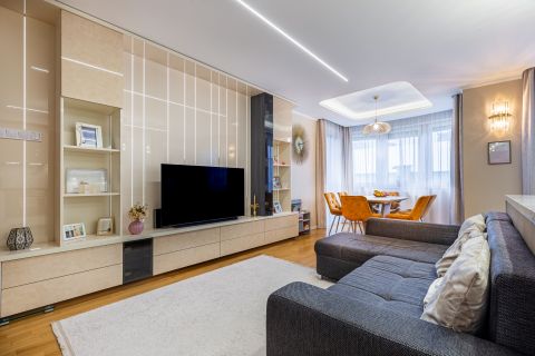 A lakás minden részletét elegancia jellemzi, a gondosan összeválogatott, igényes, modern elemek: tapéták, beépített bútorok, led lámpatestek, hangulati elemek, ledes fénycsíkok, álmennyezetek, függönyök kialakítása, hangolható világítás. Visszafogottsága révén minden korosztály számára ideális és harmonikus otthon lehet.