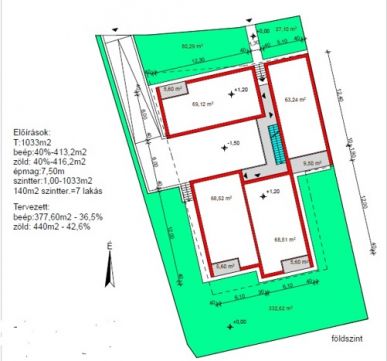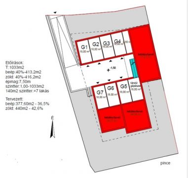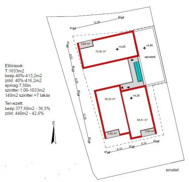 A telek beépíthetősége 40 % , a legmagasabb építési magasság 7,5 m.